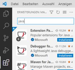 installieren wir das „Extension Pack for Java“ von Microsoft. Dadurch werden gleich mehrere Extensions in